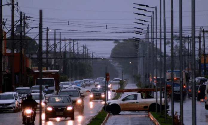 O Inmet emitiu um aviso de “perigo” para Dourados e região, válido até terça-feira. A previsão, com efeito, indica chuvas entre 30 e 60 mm/h e risco de queda de granizo, árvores e cortes de energia elétrica.